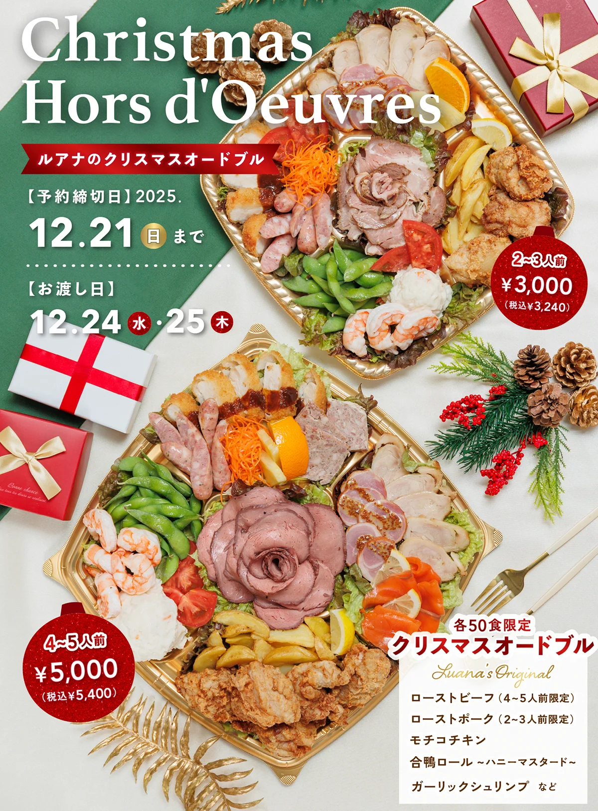 今年のクリスマスは、おうちで気軽に豪華な食卓を。LUANAのオードブルで、笑顔あふれる特別な夜をお過ごしください!