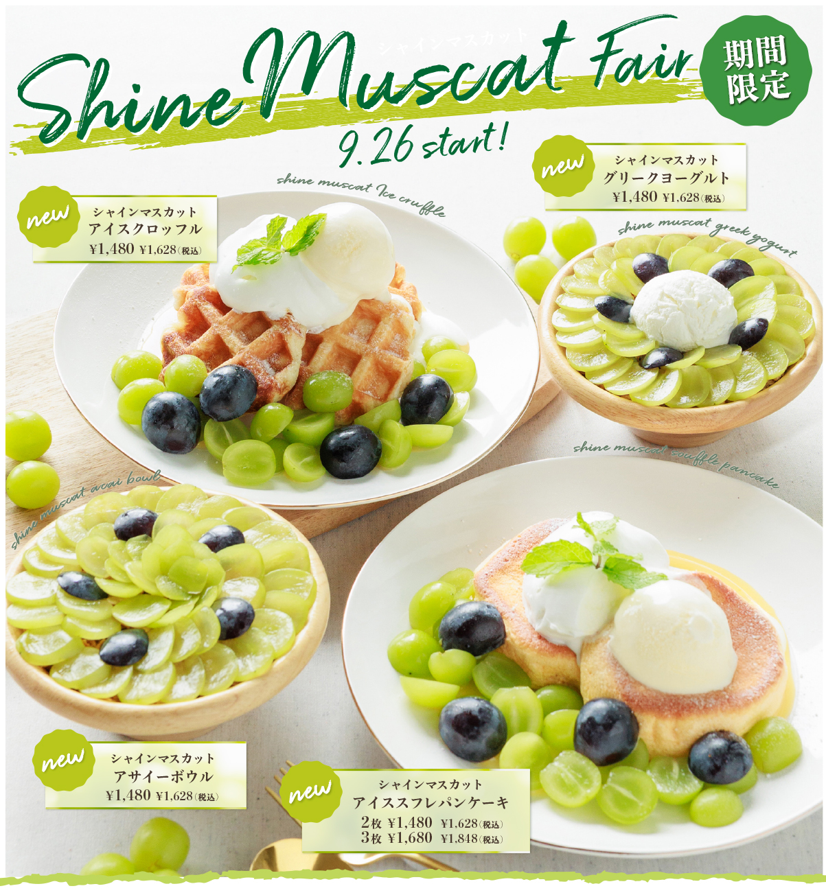 果汁たっぷりのシャインマスカットを贅沢に使用し、ワッフルパンケーキヨーグルトアサイーボウルまで、爽やかな甘さを引き立てた特別メニューをご用意しました。ひと口食べれば、みずみずしい果実が口いっぱいに広がり、濃厚なアイスやふわふわ生地との相性も抜群です。